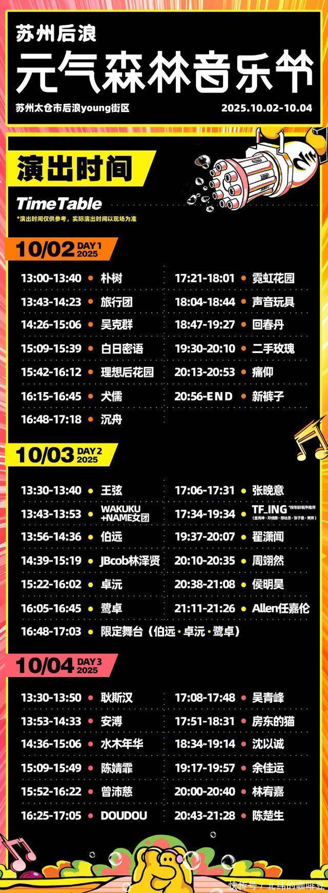 苏州——后浪·元气森林音乐节 演出时间:10日-10日 演出地点:苏州市太仓市后浪young街区 演出阵容:10日:新裤子、痛仰、二手玫瑰、回春丹、声音玩具、霓虹花园、沉舟、犬儒、理想后花园、白日密语、吴克群、旅行团、朴树 10日:Allen任嘉伦、侯明昊、周翊然、翟潇闻、TF_ING、张晚意、限定舞台(伯远·卓沅·鹭卓)、鹭卓、卓沅、JBcob林泽贤、伯远、WAKUKU+NAME女团、王弦 10日:陈楚生、林宥嘉、余佳运、沈以诚、房东的猫、吴青峰、DOUDOU、曾沛慈、陈婧霏、水木年华、安溥、耿斯汉