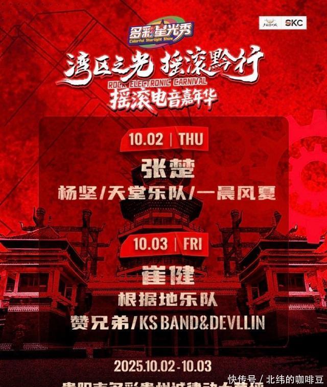 贵阳——摇滚电音嘉年华 演出时间:10日-10日 演出地点:贵阳市多彩贵州城律动大草坪 演出阵容:10日:张楚、杨坚、天堂乐队、一晨风夏 10日:崔健、根据地、赞兄弟、ksband&Devllin