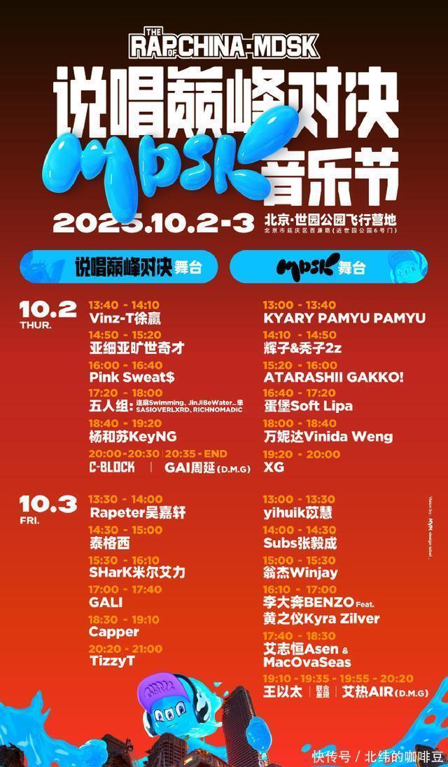 北京——说唱巅峰对决·MDSK音乐节 演出时间:10日-10日 演出地点:北京世园公园飞行营地 演出阵容:10日:GAI周延、C-BLOCK、XG、杨和苏KeyNG、万妮达VinidaWeng、五人组、蛋堡SoftLipa、PinkSweat$、ATARASHIIGAKKO!、亚细亚旷世奇才、辉子&秃z、Vinz-T徐赢、KYARYPAMYUPAMYU 10日:TizzyT、艾热AIR(D.M.G)、王以太、Capper、艾志恒Asen&MACOVASEAS、GALI、李大奔BENZOfeat.黄之仪KyraZilver、SHarK米尔艾力、翁杰Winjay、泰格西、Subs张毅成、Rapeter吴嘉轩、yihuik苡慧