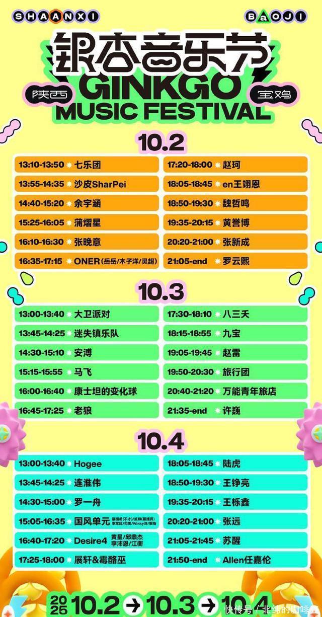 宝鸡——第四届银杏音乐节 演出时间:10日-10日 演出地点:宝鸡市陈仓区·银杏音乐公园 演出阵容:10日:罗云熙、张新成、黄誉博、魏哲鸣、en王翊恩、赵珂、ONER、张晚意、蒲熠星、余宇涵、沙皮SharPei、七乐团 10日:许巍、万能青年旅店、旅行团、赵雷、九宝、八三夭、老狼、康士坦的变化球、马飞、安溥、迷失镇乐队、大卫派对 10日:Allen任嘉伦、苏醒、张远、王栎鑫、王铮亮、陆虎、展轩&霉酪巫、Desire4、国风单元、罗一舟、连淮伟、Hogee