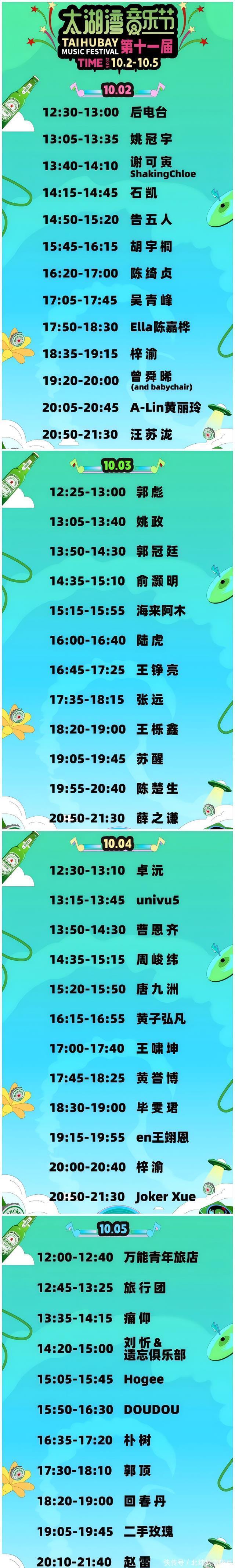 常州——第十一届太湖湾音乐节 演出时间:10日-10日 演出地点:常州嬉戏谷 演出阵容:10日:汪苏泷、A-Lin黄丽玲、曾舜晞、梓渝、Ella陈嘉桦、吴青峰、陈绮贞、胡宇桐、告五人、石凯、谢可寅、姚冠宇、后电台 10日:薛之谦、陈楚生、苏醒、王栎鑫、张远、王铮亮、陆虎、海来阿木、俞灏明、郭冠廷、姚政、郭彪 10日:薛之谦、梓渝、en王翊恩、毕雯珺、黄誉博、王啸坤、黄子弘凡、唐九洲、周峻纬、曹恩齐、univu5、卓沅 10日:赵雷、二手玫瑰、回春丹、郭顶、朴树、DOUDOU、Hogee、刘忻&遗忘俱乐部、痛仰、旅行团、万能青年旅店