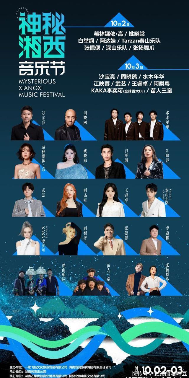 湘西——神秘湘西音乐节 演出时间:10日-10日 演出地点:湘西职院文体会展中心 演出阵容:10日:希林娜依高、姚晓棠、白举纲、阿达娃、Tarzan泰山乐队、张偲偲、深山乐队、张扬舞爪 10日:沙宝亮、周晓鸥、水木年华、江映蓉、武艺、王睿卓、阿梨粤、KaKa李奕可、苗人三蛮