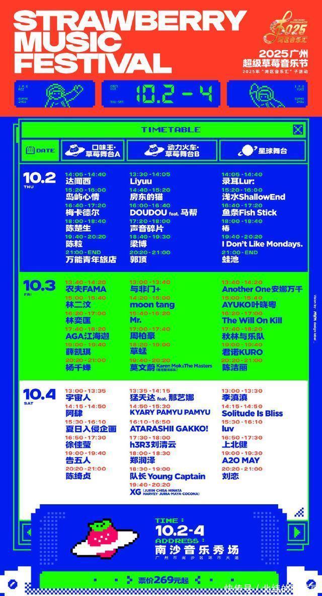 广州——超级草莓音乐节 演出时间:10日-10日 演出地点:广州站南沙音乐秀场 演出阵容:10日:〔草莓舞台〕:万能青年旅店、郭顶、陈粒、梁博、陈楚生、声音碎片、梅卡德尔、DOUDOUfeat.马帮、岛屿心情、房东的猫、达闻西、Liyuu,〔星球舞台〕:蛙池、IDon’tLikeMondays.、椿、鱼条FishStick、浅水ShallowEnd、录耳Lur: 10日:〔草莓舞台〕:杨千嬅、莫文蔚、薛凯琪、草蜢、AGA江海迦、周柏豪、林奕匡、Mr.、林二汶、moontang、农夫FAMA、与非门+,〔星球舞台〕:陈洁丽、君诺KURO、秋林与乐队、TheWillOnKill、AYUKO叶晓粤、AnotherOne安娜万千 10日:〔草莓舞台〕:陈绮贞、XG、告五人、队长YoungCaptain、郑润泽、h3R3刘清云、徐佳莹、ATARASHIIGAKKO!、夏日入侵企画、KYARYPAMYUPAMYU、阿肆、猛天达feat.那艺娜、宇宙人,〔星球舞台〕:刘恋、A2OMAY、上北健、luv、SolitudeIsBliss、李滇滇