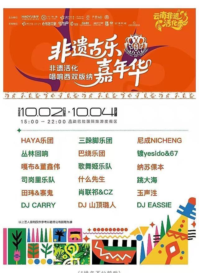 西双版纳——非遗古乐嘉年华 演出时间:10日-10日 演出地点:西双版纳傣族自治州勐巴拉国际旅游度假区 演出阵容:10日:HAYA乐团、丛林回响乐队、歌舞姬乐队、司岗里乐队、跳大海、DJEASSIE 10日:三跺脚乐团、巴绕乐团、纳苏倮本、什么先生、玉声注、D山顶路人 10日:尼成NICHENC、镀yesido&67、嘎布&董鑫伟、田玮&寨鬼、肖联祁&CZ、DJCARRY