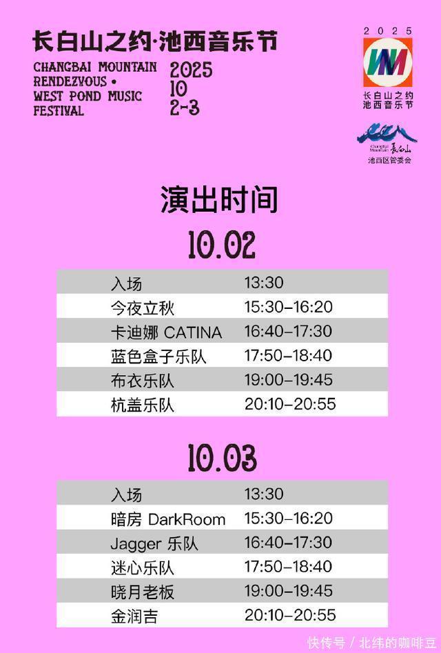 长白山——池西音乐节 演出时间:10日-10日 演出地点:湘长白山之约池西音乐节 演出阵容:10日:杭盖乐队、布衣乐队、蓝色盒子乐队、迪娜CATINA、今夜立秋 10日:金润吉、晓月老板、迷心乐队、Jagger乐队、暗房DarkRoom