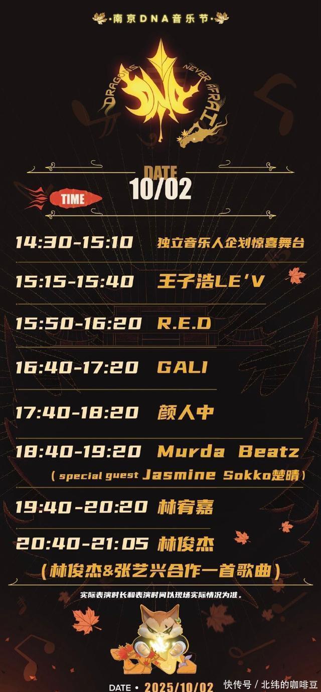 南京——DNA音乐节 演出时间:10日 演出地点:南京鼓楼幕燕滨江上元门音乐草坪 演出阵容:林俊杰(&张艺兴合作一首歌)、林宥嘉、MurdaBeatz、颜人中、GALI、R.E.D、王子浩LE`V、独立音乐节企划惊喜舞台